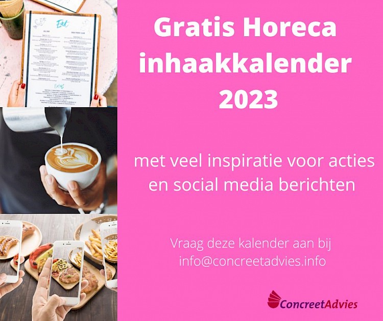 Wil je je goed kunnen voorbereiden op je (Social Media) campagnes in 2023? Bestel dan nu gratis de digitale Horeca Inhaakkalender 2023! Stuur een mail met je aanvraag naar info@concreetadvies.info