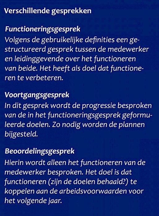 Het is het meest gehoorde manco van die verplichte gesprekken die leidinggevenden en medewerkers geacht worden te voeren gedurende een jaar. Een functioneringsgesprek in de eerste maanden, een voortgangsgesprek halverwege en een beoordelingsgesprek aan het eind; zo staat het ongeveer opgeschreven in het Arbeidsvoorwaardenreglement (AVR 2017) van de Horeca. Maar wat maken al die verschillende termen uit, zo hoor je medewerkers klagen, als ik gewoon drie keer op mijn donder krijg?