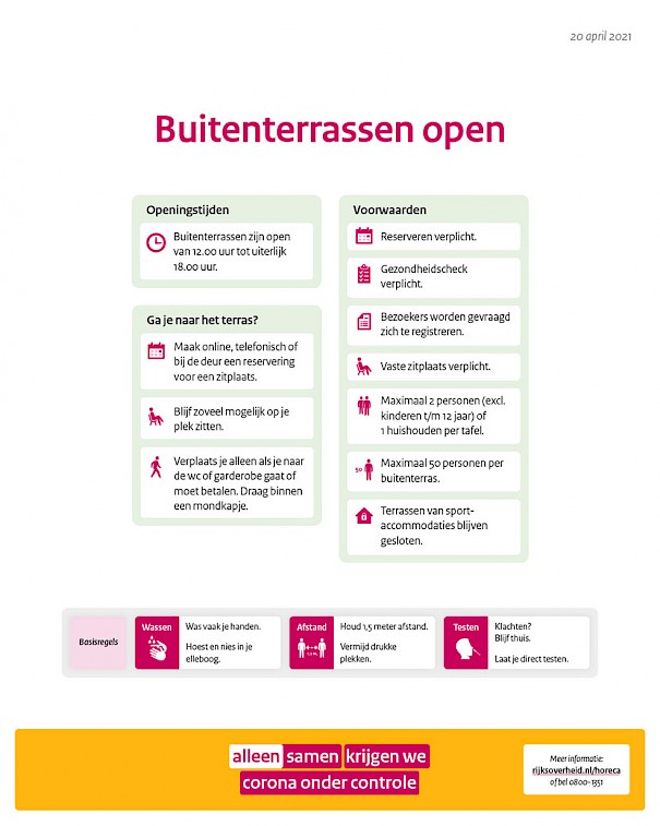 Vanaf woensdag 28 april mogen de buitenterrassen van eet- en drinkgelegenheden weer open. Er gelden wel voorwaarden. Welke voorwaarden dat zijn lees je hier.